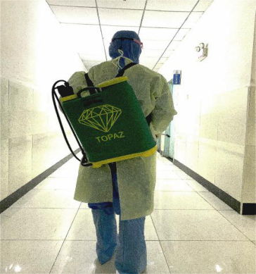 消毒感控岗是守护全体队员安全的第一道防线,天津医疗队接管的武钢二医院是一座4层的小楼,康萍护士长所在的小组负责从1层到3层的全部消毒工作,她每天背着装有6000毫升消毒溶液的装备,从绿区到黄区,小到每一个房间的门把手,大到所有墙面地面,都要清洁擦拭消毒。6小时的工作时间中,要反复喷洒消毒4次,不放过任何一个角度、任何一处细节。在一次深夜的突发事件中,康萍护士长了解到楼道存在被污染的风险,而下一班次人员还未到岗的情况下,她当机立断,立即配好溶液,从二楼到四楼,反复喷洒了两次,守护了全体医护人员的安全。